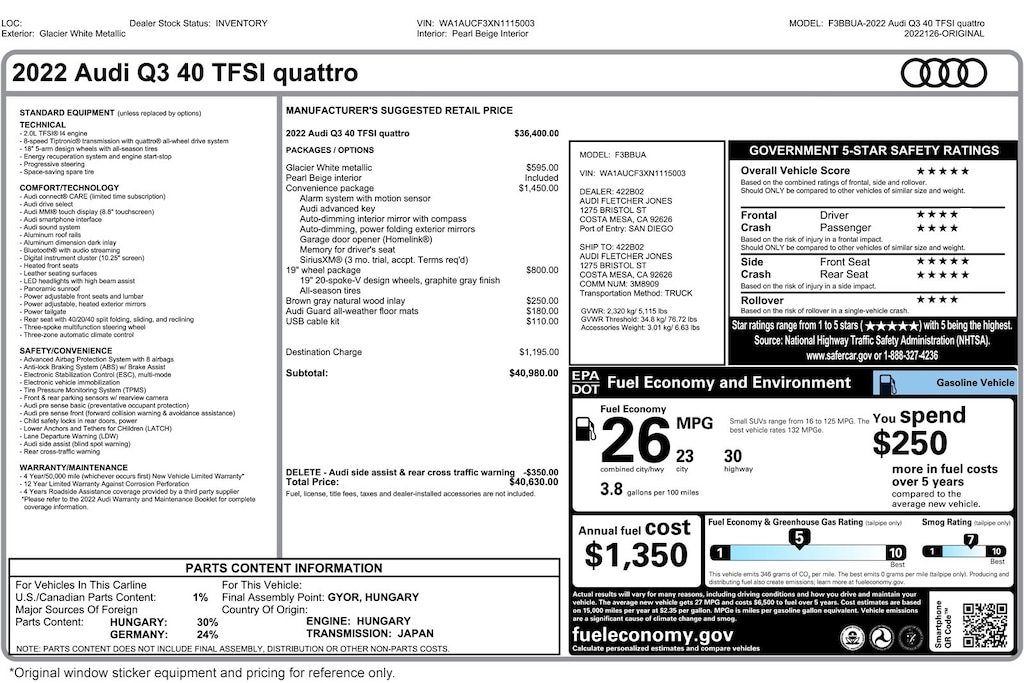Audi Fletcher Jones presents this 2022 Audi Q3 Premium 40 TFSI quattro. This Audi has 34,349 miles and comes in a Glacier White Metallic on Pearl Beige color combination. Live out of the area? Contact us to discuss convenient delivery options. (949) 791-1500